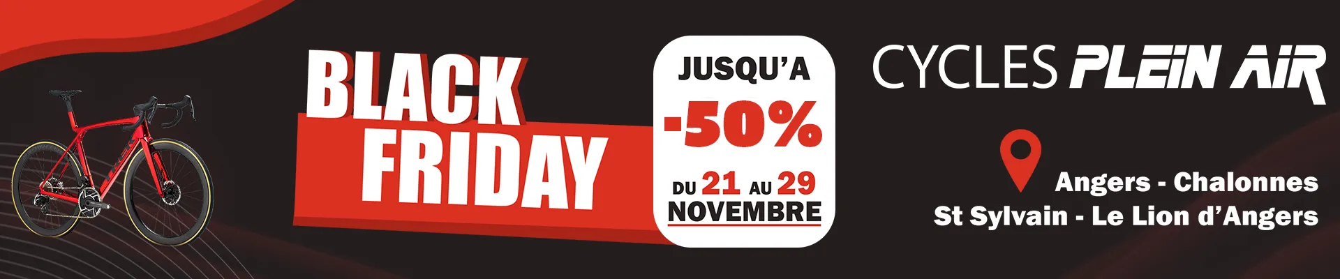 Du 21 au 29 novembre, Cycles Plein Air vous propose une multitude d’offres exceptionnelles pour vous faire plaisir avec un nouveau vélo ou pour faire le plein d’équipements et accessoires !