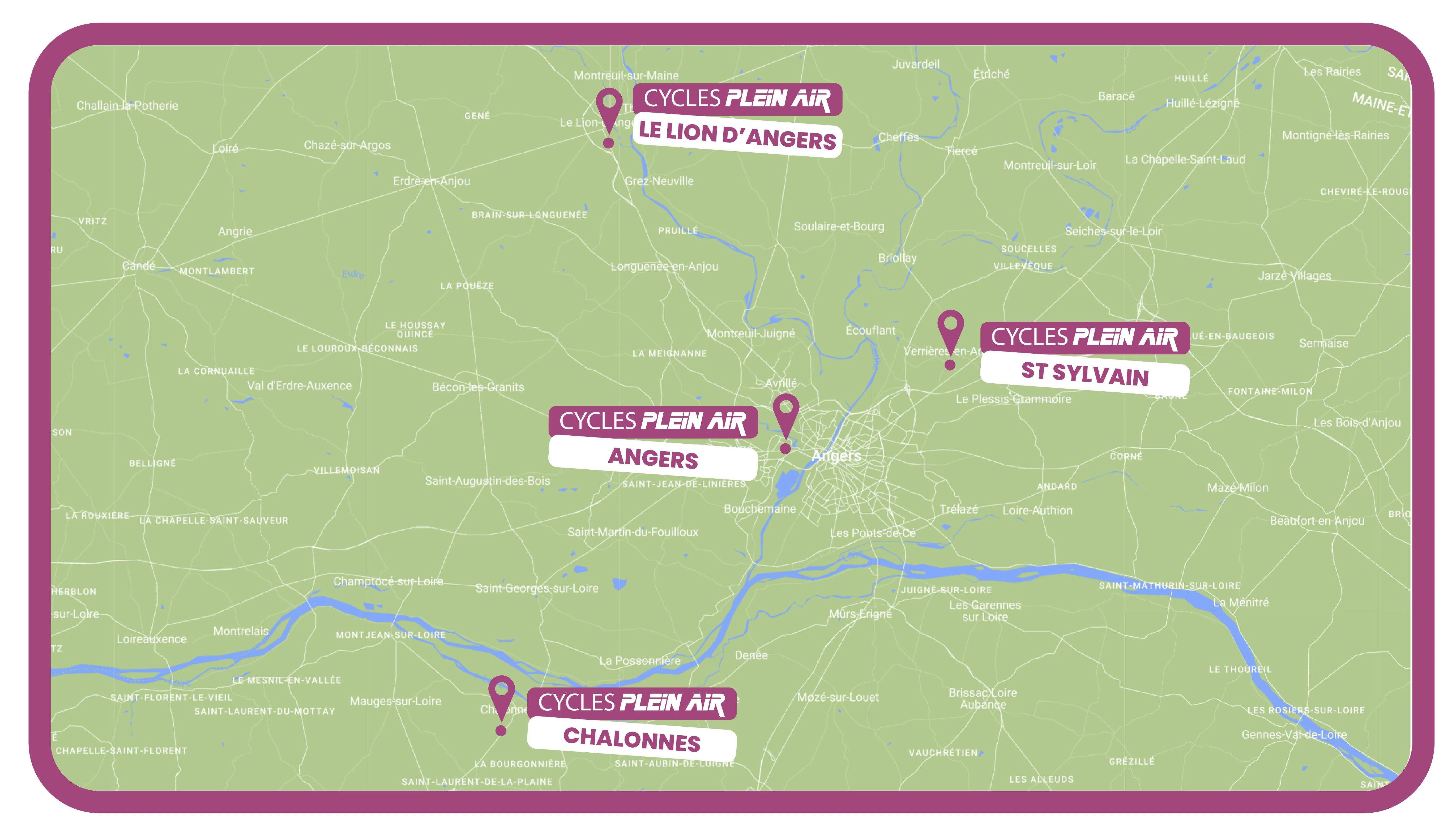 Rendez-vous dans vos 4 magasins Cycles Plein Air, Angers, Chalonnes, Le Lion d’Angers et St Sylvain, pour une nouvelle formule au plus proche de chez vous, pour y découvrir l’univers du cycle.
