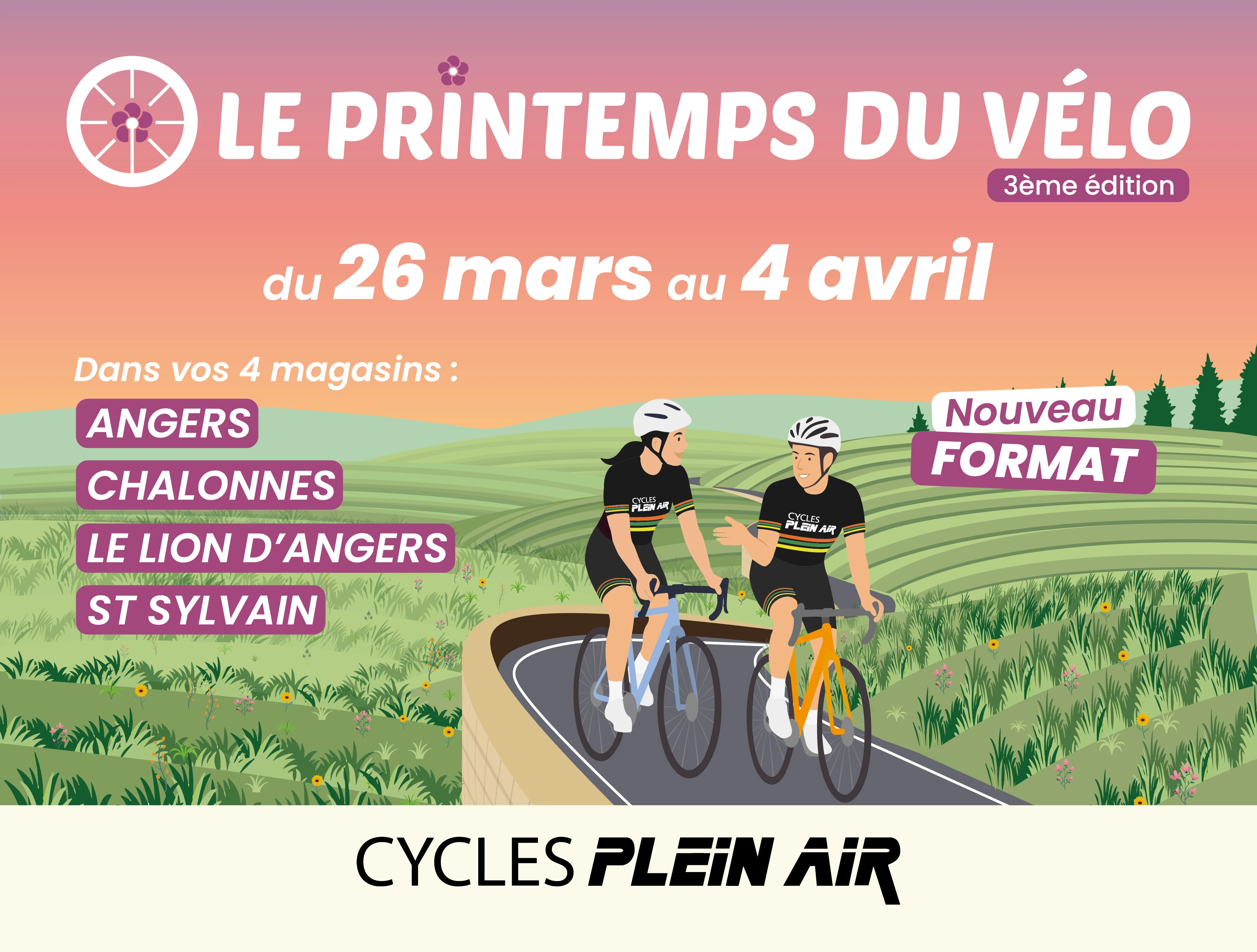 Nouvelle formule pour la troisième édition du Printemps du Vélo, Cycles Plein Air vous accueille au cœur de ses 4 magasins du 26 mars au 4 avril 2026, venez découvrir, tester, apprendre, jouer et profiter de réductions exceptionnelles sur ces 10 jours d’événements.