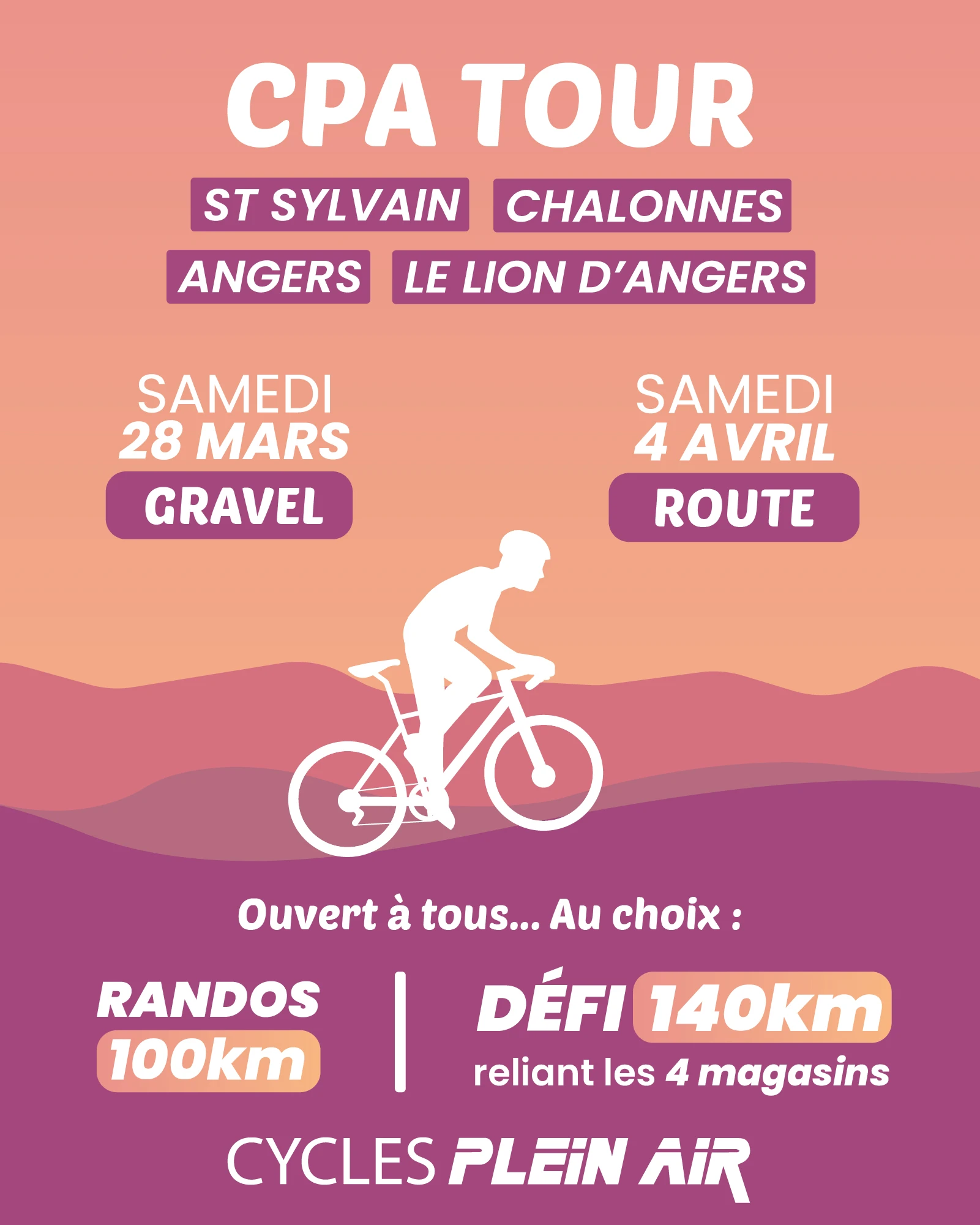➡️ Le DÉFI CPA TOUR est un challenge de 140km reliant les 4 magasins Cycles Plein Air, à parcourir en Gravel ou en Route.